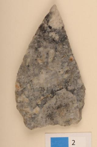 Instrumento lítico usado como cabeza de proyectil arrojadizo. Tiene forma triangular redondeada, hombros rectos y base recta. Está elaborado en piedra tallada bifacialmente y retocada. Color gris.