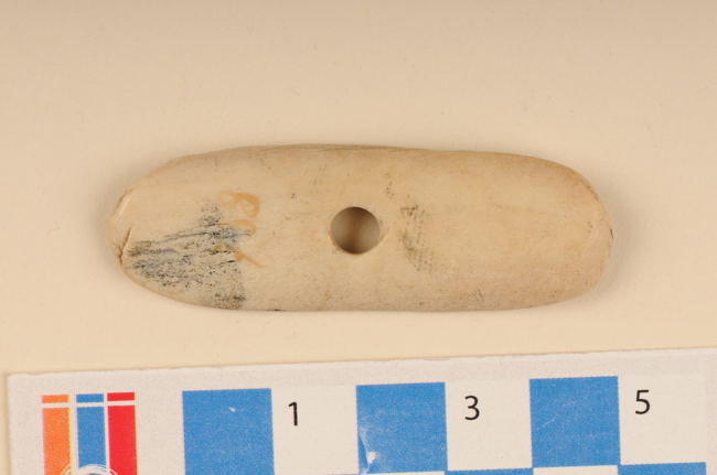 Instrumento óseo usado en conjunto con el huso de hilar para fabricar la hebra. Tiene forma ovalada de sección plana y perforación en el sector central. Está elaborado en hueso tallado y pulido de color marrón claro.