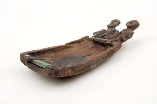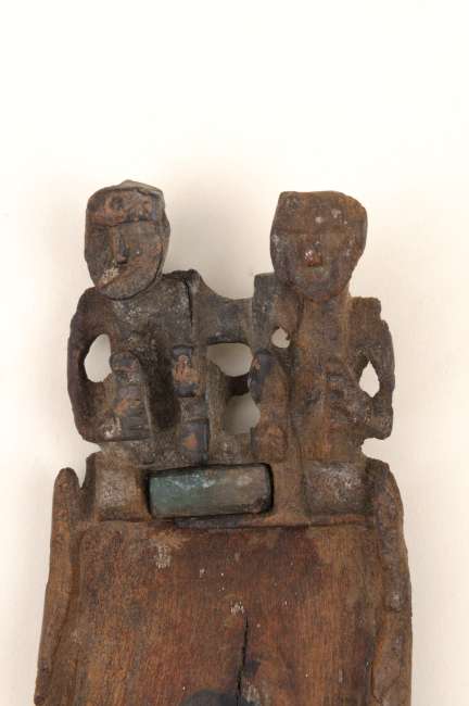 Objeto correspondiente al Complejo alucinógeno. Tallado en madera en una sola pieza, presenta un receptáculo de forma rectangular que se prolonga en un apéndice escultórico con dos figuras antropomorfas en uno de sus lados más angostos. Estas se representan en posición sedente, con las rodillas flectadas y las manos apoyadas sobre ellas; muestran nariz y frente en relieve y ojos indicados mediante incisiones. El conjunto se encuentra ornamentado con incrustaciones de piedra semipreciosa, posiblemente turquesa o malaquita.
