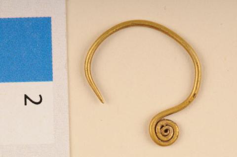 Adorno de uso personal que se lleva pendiente en el lóbulo de la oreja. Tiene forma alargada y curva con sección circular y se encuentra decorad con una voluta en uno de los extremos. Metal de color dorado brillante.