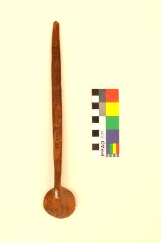 Objeto de madera compuesto por una sección rectangular oblonga que termina en un receptáculo cóncavo circular.