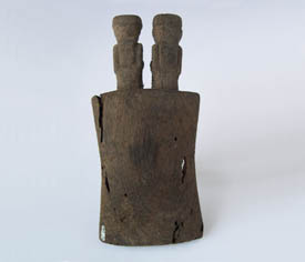 Objeto de una sola pieza, cuyo receptáculo tiene sus lados ligeramente cóncavos y una prolongación con dos figuras antropomorfa acuclilladas con los pies hacia el receptáculo, los rostros ovalados,una incisión lineal como ojos, nariz tallada, tocado cefálico cilíndrico. La cabellera nace desde el tocado cefálico y les cubre media espalda.