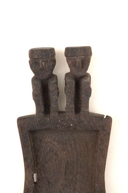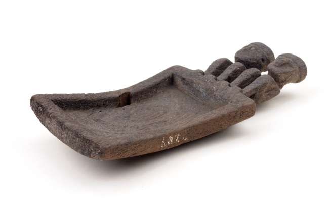 Objeto correspondiente a un complejo alucinógeno. Tallado en madera en una sola pieza, de forma general rectangular, cuyo receptáculo presenta los lados ligeramente cóncavos y, en uno de sus lados más angostos, una prolongación escultórica con dos figuras antropomorfas en posición acuclillada, con los pies orientados hacia el receptáculo. Las figuras presentan rostros ovalados con ojos indicados mediante incisión lineal, nariz tallada y tocado cefálico de forma cilíndrica. La cabellera se origina desde el tocado y se extiende hasta cubrir parte de la espalda. La superficie exhibe color marrón natural.