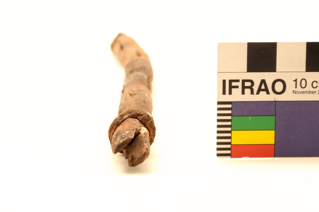 Objeto oblongo de sección circular y cuerpo irregular levemente curvado. Anillo de cuero en uno de sus extremos y terminación con corte transversal que logra abertura triangular. En el extremo opuesto área desvastada, anillo de mayor grosor y terminación en punta redondeada.