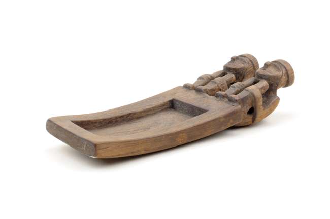 Objeto correspondiente al Complejo alucinógeno. Tallado en madera en una sola pieza, presenta un receptáculo de forma rectangular que, en uno de sus lados más angostos, se prolonga mediante un elemento escultórico labrado con dos figuras antropomorfas. Estas se representan en posición sedente, con las rodillas flectadas y las manos apoyadas sobre ellas. Todo es de color marrón natural.