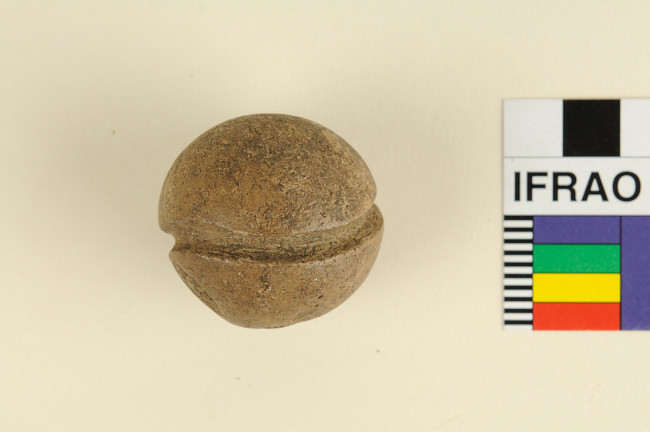 Instrumento utilizado en la pesca. Objeto de forma esférica construida en piedra de color marrón. Presenta un surco ecuatorial profundo con la finalidad de permitir la sujeción de embarrilados. Presenta también un desgaste en eje contrario al surco como marca de sujeción.