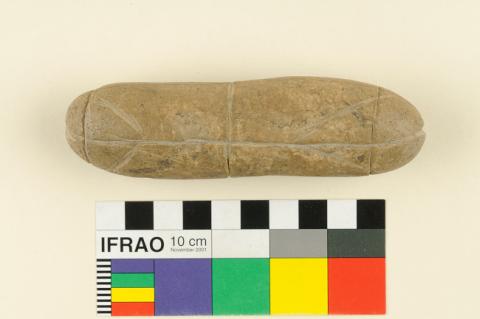 Objeto lítico para uso ritual o como emblema de mando. Forma oblonga de sección cilíndrica de extremos redondeados. Presenta decoración incisa formada por escotaduras sagitales y una transversal y dos más en inicios de redondeo terminal, además de escotaduras diagonales naciendo desde tercio medio. De color beige.