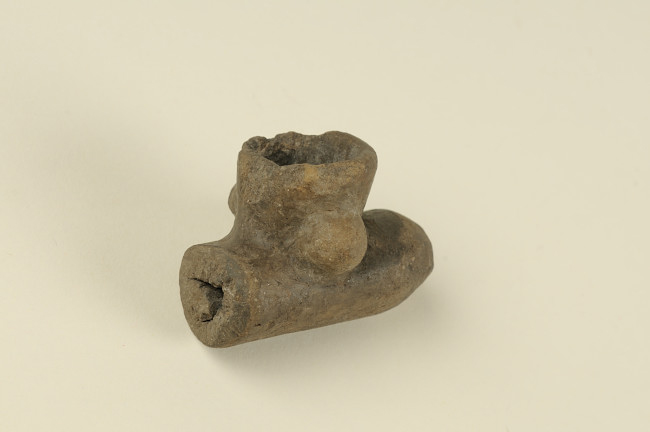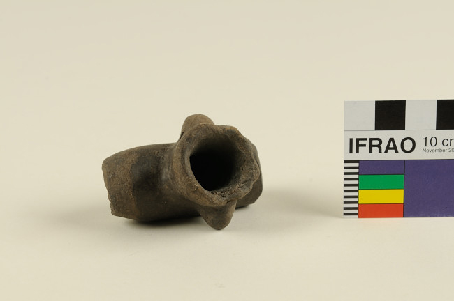 Artefacto fumatorio de cuerpo tubular. En la parte superior hornillo cilíndrico en sobre relieve con protuberancias mamelonares en ambos laterales. En extremos presenta perforación hacia el interior a modo de doble boquilla. Superficie color marrón.