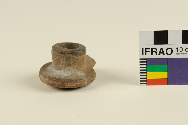 Artefacto fumatorio elaborado en material cerámico, usado en contextos mapuche de ritualidad ceremonial, política y/o social. Su forma es discoidal con hornillo central, de bordes redondeados, tubo de aspiración fragmentado. El hornillo es circular, restringido de labio recto. Superficie alisada y engobada de color marrón.