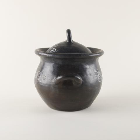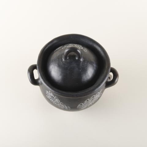 Se encuentra elaborada en cerámica, de color negro brillante y con decoración incisa en blanco, la olla presenta ramas de laurel y la tapa una flor y hojas.