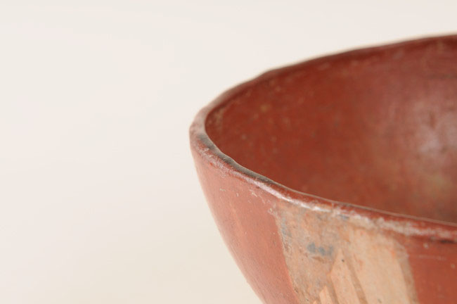 Recipiente simétrico hemisférico, no restringido de perfil simple. Borde redondeado con labio recto y base levemente plana. Ambas superficies están pulidas: la interior posee engobe rojo; la exterior presenta decoración pintada blanca en dos bandas transversales y elementos intermedios con diseño de cuerdas entretejidas sobre engobe rojo.