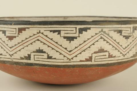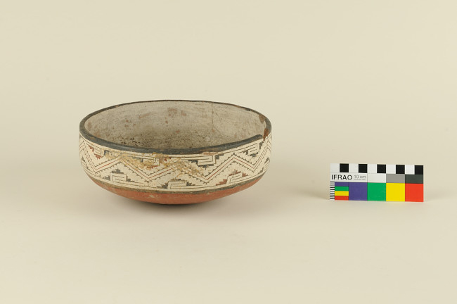 Vasija simétrica, no restringida, de perfil compuesto. El borde es recto con labio redondeado, cuerpo cilíndrico y base semiesférica. Superficies pulidas, la interior presenta engobe blanco y la exterior con decoración en banda con pintura polícroma negro y rojo sobre blanco, con patrón decorativo zigzag. Base con engobe rojo.