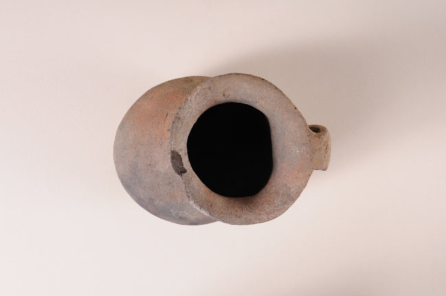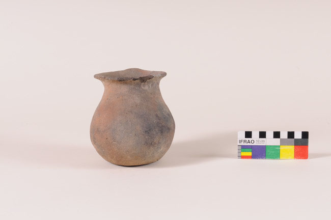 Objeto de uso doméstico. Contenedor asimétrico restringido de cuerpo ovoide, con cuello corto y cilíndrico de labio evertido. Base plana. Posee un asa en arco de sección circular que nace en el labio y se inserta en la unión cuello-cuerpo. Superficie alisada hasta el borde externo, de color marrón.