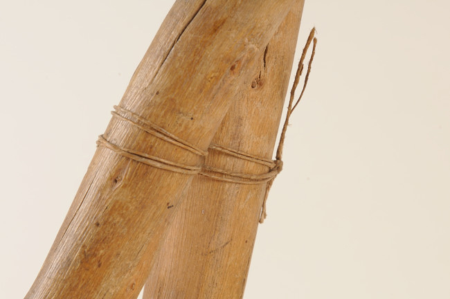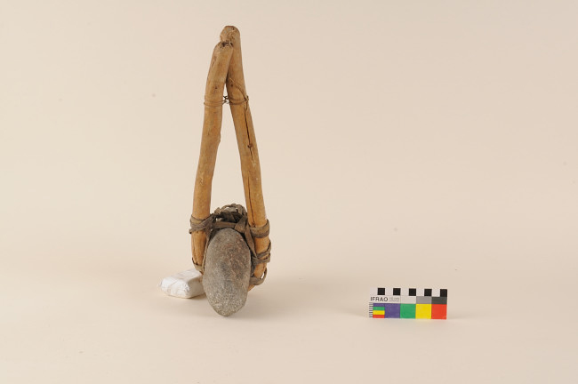 Herramienta de uso doméstico consistente en piedra oblonga atada mediante ancho amarre de cuero a madero flectado que se une en su zona proximal mediante cordón de fibras vegetales. Piedra semi elipsoide de color gris con inclusiones blancas. Madero de sección circular