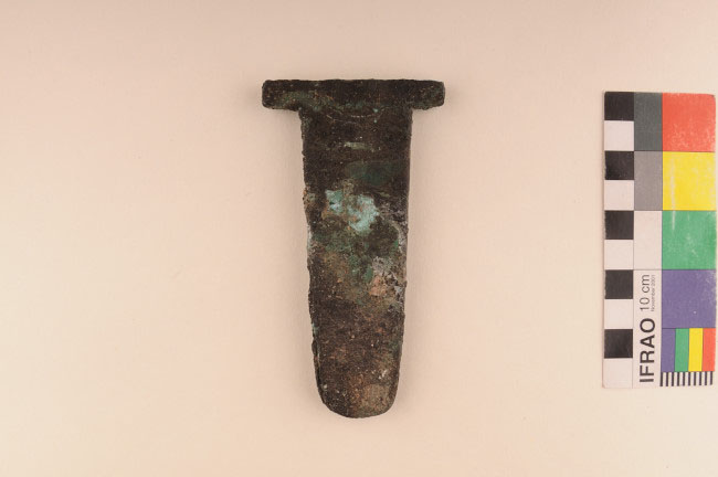 Pieza laminar de cobre en forma de "T". Su área vertical de forma rectangular con terminación redondeada y su extremo proximal terminado en dos aletas horizontales. Color verde negruzco oscuro con manchas blanquecinas.