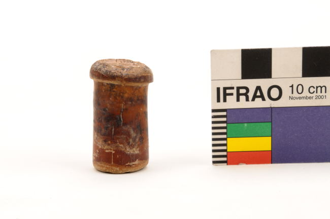 Contenedor rígido de forma tubular con un extremo cerrado. En su interior se observan restos de mazorca de maíz que posiblemente haya funcionado como tapa. Madera tallada y pulida de color marrón.