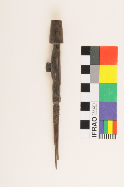 Objeto componente del conjunto para consumo de alucinógenos. Realizado en una pieza de madera tubular de color oscuro con ensanchamiento de la boquilla en uno de sus extremos y una figura antropozoomorfa en la parte media del tubo.