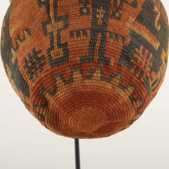 Contenedor textil de forma elipsoide y base redondeada. Presenta decoración tejida con colores rojo, azul y amarillo con representaciones geométricas y una figurativa antropomorfa.