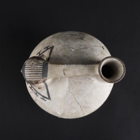 Contenedor restringido de cuerpo cilíndrico y base troncocónica de terminación cóncava. En zona superior rostro antropomorfo unido a gollete de paredes evertidas y labio redondeado unidos por asa cinta horizontal recta. Presenta decoración pintada en colores negro y rojo sobre fondo blanco en patrón geométrico y reticulado central. Rostro y zona frontal con representación de torso antropomorfo.