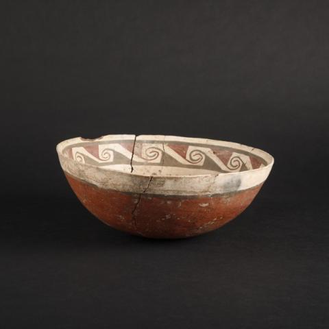 Recipiente de abierto de cuerpo hemisférico, base cóncava y borde levemente evertido. Superficie pulida con decoración pintada. En interior banda superior con volutas en color negro y rojo sobre blanco. Exterior con franja blanca delimitada por línea negra.