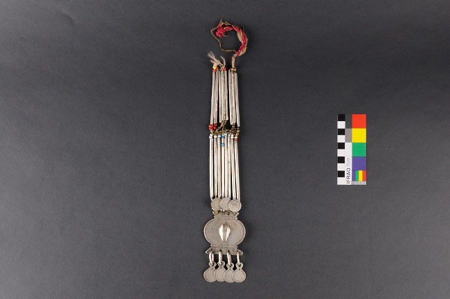 La sección superior se conformado por dos series de ocho tubos divididos por cuentas mientras que el sector inferior se conforma por tres monedas bajo la cual se ubica una placa ovoidal que lleva en su centro una figura en relieve y una línea doble punteada por todo el perímetro de la placa. La parte inferior es de forma trapezoidal con cuatro perforaciones en las que se ubican arandelas de las cuales penden cuatro pines circulares, los que también tienen una doble línea punteada por su perímetro.