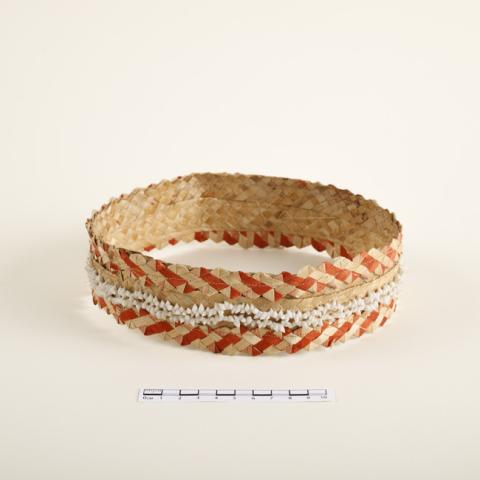 Objeto utilizado como adorno personal. De forma cilíndrica se conforma por una trama de fibras vegetales planas tejidas intercalando colores beige y anaranjado. Ocupando la zona media de la superficie exterior, una serie de pequeñas conchas de color blanco unidas por un hilo se atan aumentando volumen en la zona frontal.