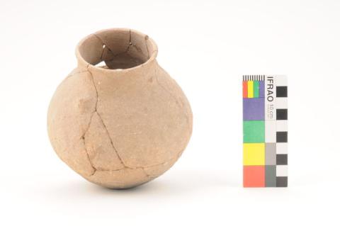 Ceramio simétrico, restringido con cuello de perfil inflectado. Presenta base convexa, cuerpo esférico, cuello cilíndrico muy corto, de borde evertido y labio redondeado. Dos protuberancias en la unión cuello/cuerpo.Superficie alisada sin decoración.