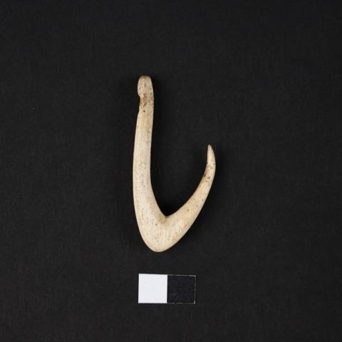 Instrumento usado para la pesca. De forma curva con fuste más largo y con engrosadura terminal para sujeción a hilo. Vástago aguzado. Elaborado en hueso tallado y pulido de color claro.