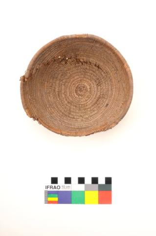 Recipiente para contener alimentos u otros elementos, elaborado mediante el entrelazamiento de fibras vegetales de color marrón para formar un recipiente de forma cónica de base plana.