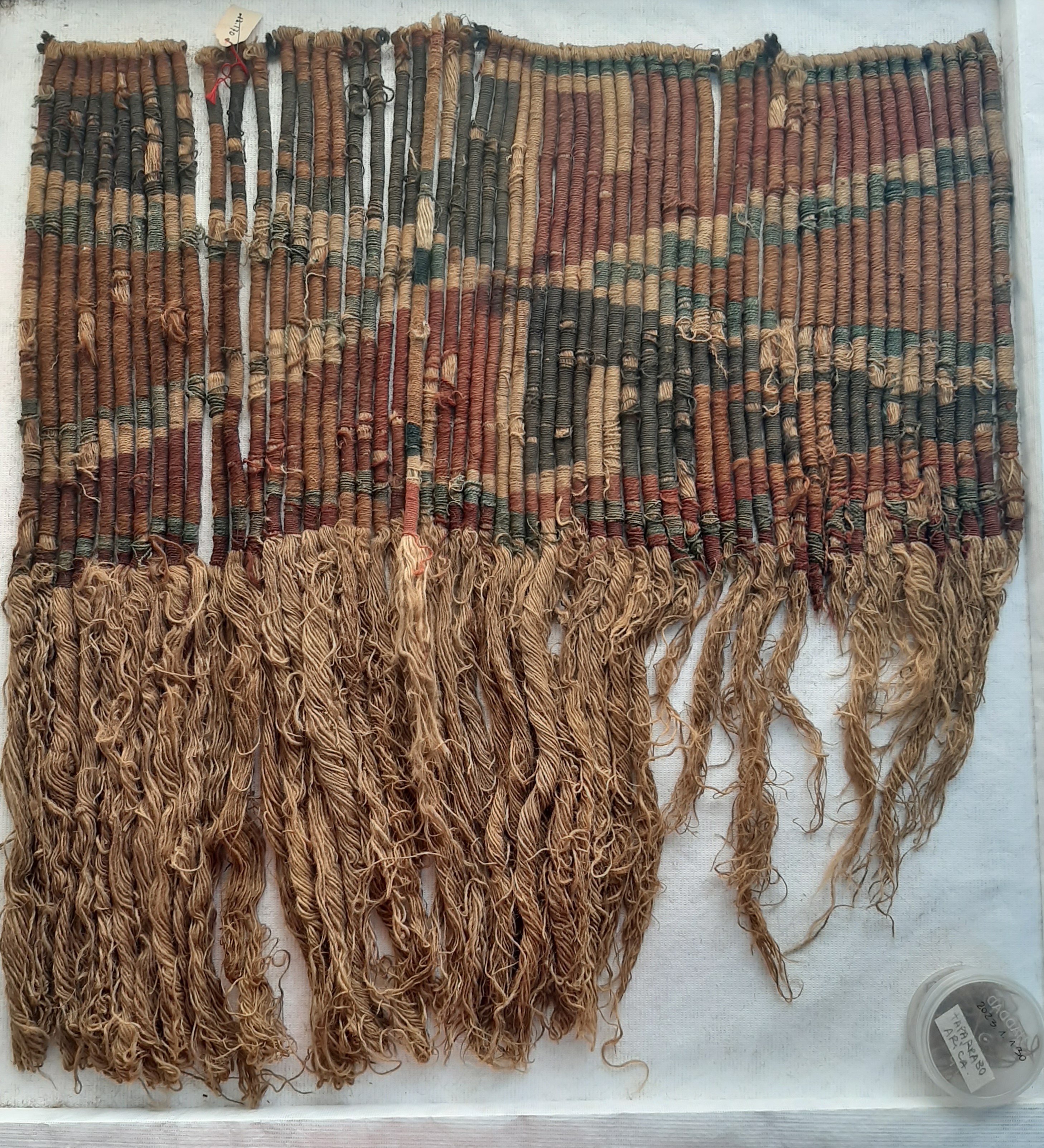 Posible prenda de indumentaria denominada, taparrabo, mandil, faldellín y delantal. Pieza textil rectangular compuesta por un cordón transversal de color marrón oscuro desde donde se entrelazan 56 cordones elaborados por 20-22 hilos de color crudo que se tuercen sobre si mismos. Estos además están embarrilados con hilos de colores hasta la mitad de su longitud conformando un diseño de formas geométricas simétricas. Y la pieza n° inv. 13170 corresponde a un cordón faltante (seria el n°57) que se inserta perfectamente dentro del patrón del diseño.