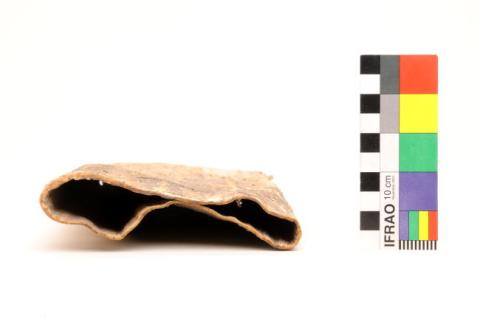 Contenedor usado para llevar flechas. Tiene forma rectangular irregular con el extremo superior recto y la base redondeada. Cuero curtido y cosido de color marrón claro con manchas.
