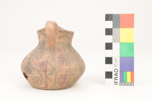 Ceramio pequeño de cuerpo globular y base plana. Cuello corto recto, labio redondeado. Un asa labio/cuerpo. Superficie pulida y engobada. Diseños café y rojo de doble espiral y grecas en el cuerpo y cuello.
