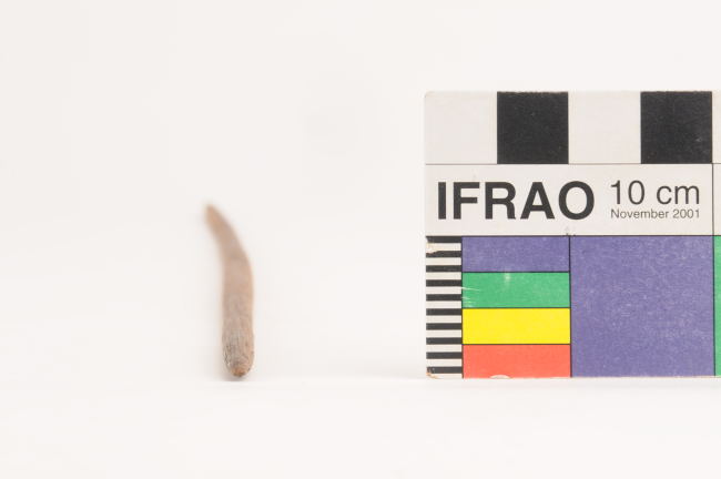 Instrumento usado en conjunto con la tortera para hilar. Objeto oblongo con ambos extremos adelgazados. Escotadura en una de sus terminaciones. Madera tallada y pulida de color marrón claro.