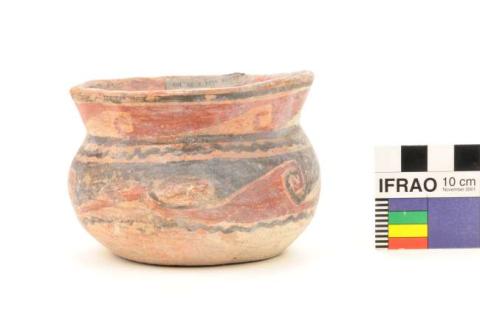 Ceramio globular de base plana. Cuello corto evertido, labio redondeado. Dos protuberancias en el cuerpo. Superficie pulida y engobada con diseños geométricos en el cuerpo y cuello en rojo y negro.
