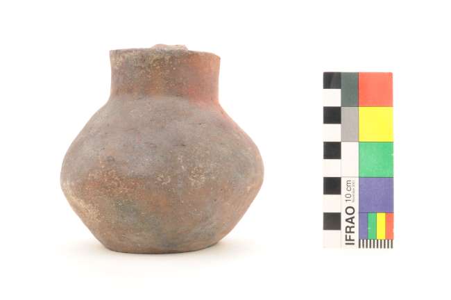 Ceramio globular de base plana. Cuello corto recto, labio redondeado. Un asa labio/cuerpo. Superficie alisada sin decoración pintada de rojo.