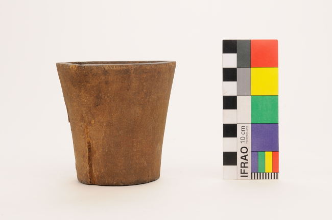 Contenedor abierto de perfil simple. Tiene labio recto, cuerpo troncocónico invertido y base plana. Está elaborado en madera tallada y pulida de color marrón oscuro.