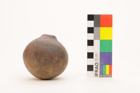 Ceramio globular de base cóncava. Boca restringida, labio redondeado. Superficie pulida y engobada. Parte superior del cuerpo pintada de rojo con diseño de bandas zigzag en café.