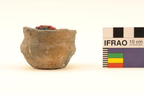 Pequeño ceramio con textil en su interior. Ceramio globular de pase plana y boca ancha. Superficie de terminación burda sin decoración. En su interior textil rojo y azul tejido con técnica de red.