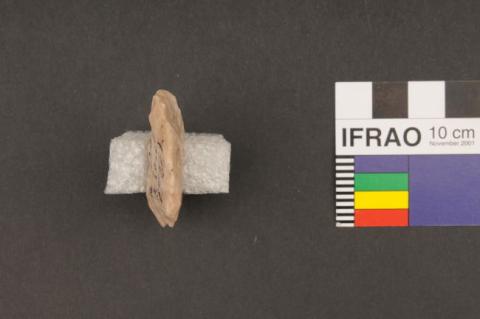 Herramienta lítica. Tiene forma ovalada irregular, de sección plana con un extremo apuntado para su uso funcional. Piedra tallada bifacialmente de color marrón claro.