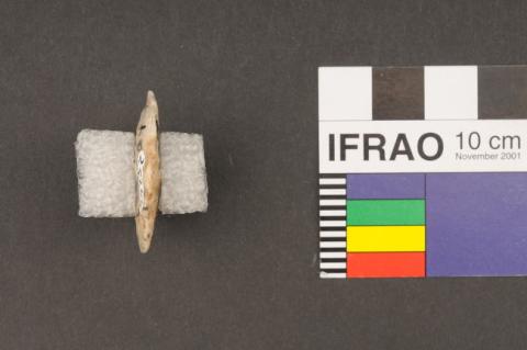 Herramienta lítica utilizada como cabeza de proyectil arrojadizo. Tiene cuerpo lanceolado y base convexa. Talla bifacial con retoque bimarginal. Color marrón claro con manchas oscuras.