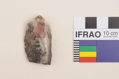 Instrumento lítico inacabado. Objeto de forma rectangular irregular, de punta redondeada, base recta y bordes retocados. Piedra tallada de color gris con vetas rosado claro.