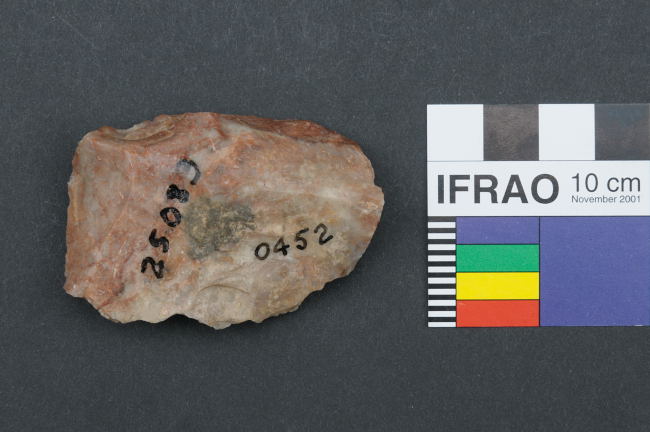 Instrumento lítico inacabado. Tiene forma ovalada irregular con extremos aguzados y bordes retocados. Está elaborado en piedra tallada bifacialmente. Colo marrón claro.