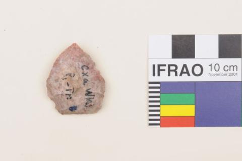 Instrumento lítico usado como cabeza de proyectil arrojadizo. Tiene forma triangular con base plana. Está elaborado en piedra tallada bifacialmente y retocada. Color rosado.