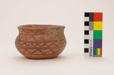 Ceramio globular de base plana y boca ancha. Cuello corto recto, labio redondeado. Dos protuberancias cuello/cuerpo. Superficie pulida y engobada. Bandas horizontales rojas, en su interior grecas escalonadas negras.