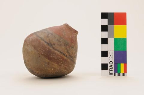 Ceramio globular ápodo de boca restringida. Superficie pulida y engobada. En la mitad superior bandas rojas y banda central con diseño escalonado en negro.
