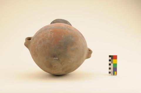 Ceramio globular ápodo. Cuello tronco cónico. Dos asas en el ancho máximo del cuerpo. Superficie pulida y engobada con decoración geométrica negro y rojo.