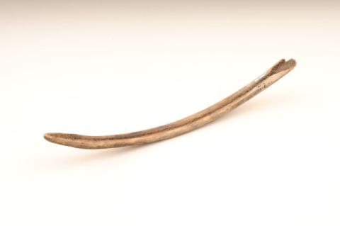 Instrumento de forma alargada, de sección semicircular y curva. Presenta acanaladura longitudinal y uno de sus extremos se encuentra tallado en forma de punta. Hueso de color marrón claro.