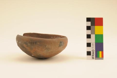 Contenedor abierto de perfil simple. Tiene borde redondeado, cuerpo globular y base convexa. Cerámica modelada y pulida de color marrón rojizo.