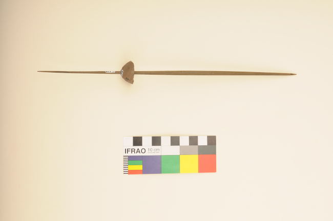 Madero oblongo de sección cilíndrica y ambos extremos aguzados. En uno de ellos, pieza tronco cónica de madera inserta (tortera)