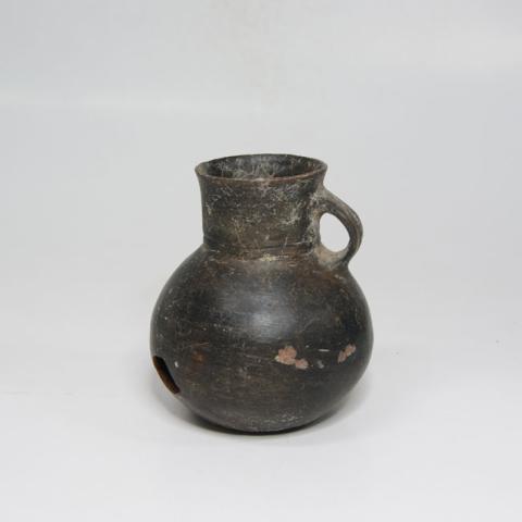 Pieza simétrica, de estructura restringida con cuello, de perfil compuesto, cuerpo de forma esférica, cuello levemente hiperboloide, boca de borde evertido y labio plano. La base es plana, tiene un asa en arco de correa de sección rectangular con emplazamiento cuello/tercio superior del cuerpo; la superficie está alisada y pulida. El cuello está decorado con una línea incisa perimetral en la sección inferior. La vasija es de color negro y la pasta parda rojiza, fina.
